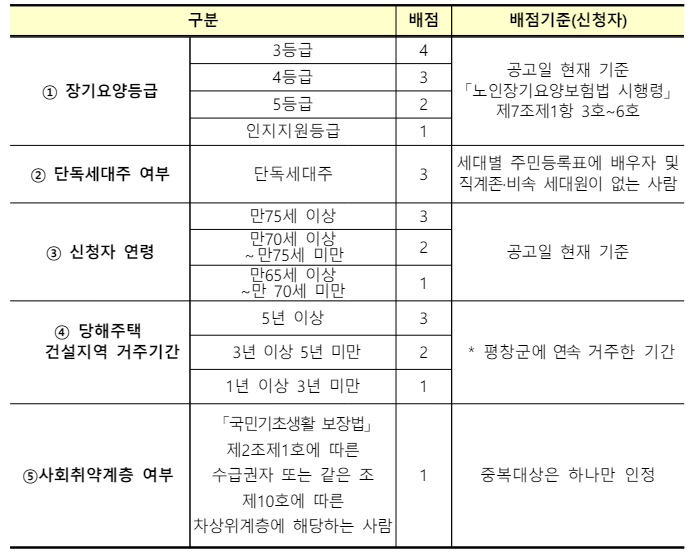 | 만 65세 이상 | 1순위 | 국민기초생활보장법 상의 생계급여수급자 또는 의료급여수급자 | |