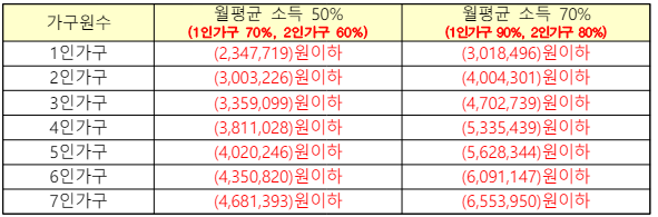 | 3순위 | 전년도 도시근로자 가구원수별 가구당 월 평균소득 50% (1인 70%, 2인 60%) |