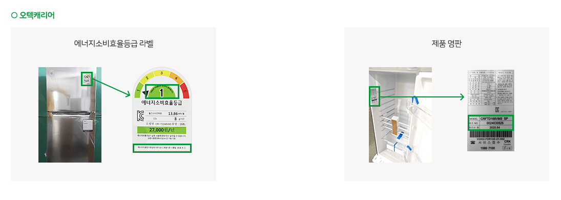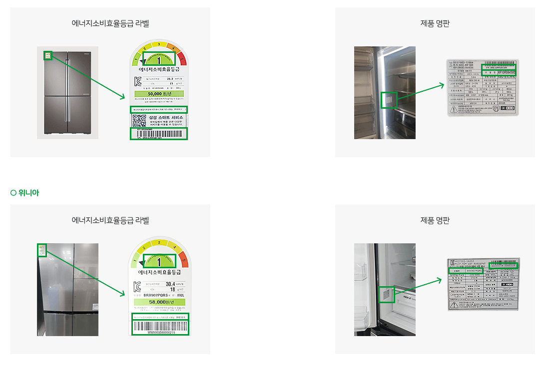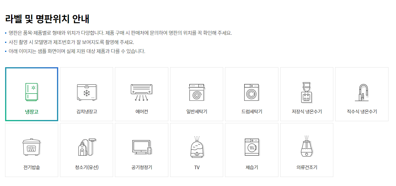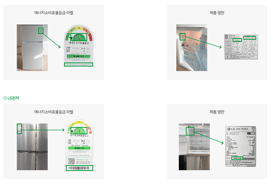 명판은 품목, 제품별로 형태와 위치가 다양합니다. 사진촬영 시 모델명과 제조번호가 잘 보여야 합니다. 냉장고 기준으로 회사마다 다양한 곳에 에너지등급 라벨이 있습니다.