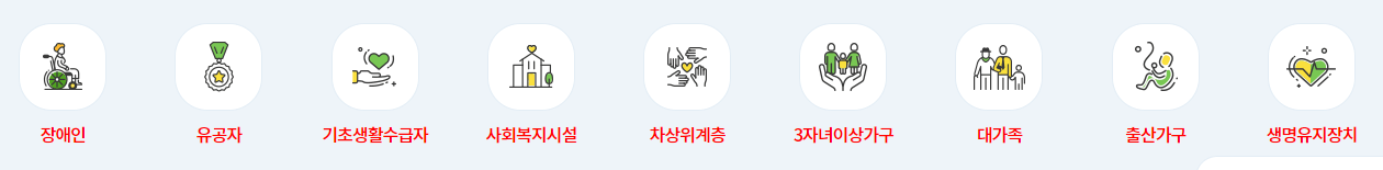 2. 국가유공자 : "국가유공자등예우 및 지원에 관한 법률"에 의한 1~3급 상이자 상이유공자 : "5.18 민주유공자예우에 관한 법률"에 의한 3. 1~3급 상이자 독립유공자 : "독립유공자 예우에 관한 법률"에 의한 독립유공자 또는 독립유공자의 권리를 이전받은 유족 1인 생계