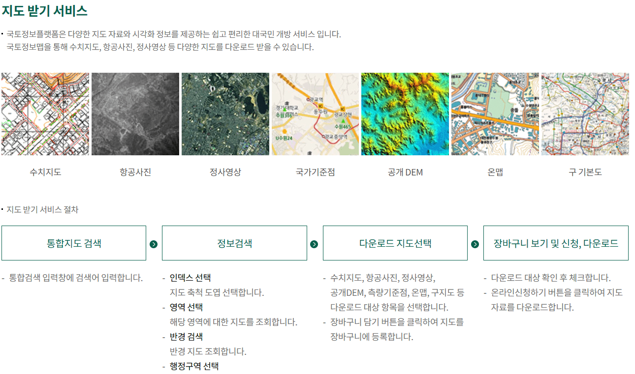 - 지형도/수치지형도: 지형에 대한 공간정보 데이터 확인 및 다운로드