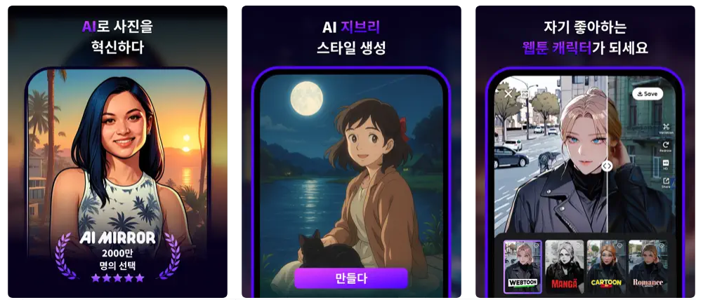 중국에서 인기 있는 사진 편집 어플 Meitu는 만화 필터 분야에서도 강력한 기능을 제공합니다. 특히 일본풍 애니메이션 스타일이나 소녀 감성 일러스트를 좋아하는 분들께 강력 추천합니다. AI 스타일 변환 기능을 사용하면, 몇 초 만에 셀카를 애니메이션 캐릭터처럼 변환해 줍니다.