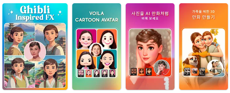 Voila는 셀카 한 장만으로 디즈니풍 캐릭터, 르네상스 초상화, 2D 만화, 3D 카툰 등 다양한 변환을 할 수 있는 어플입니다. 특히 얼굴 디테일을 고급스럽게 표현해주어 프사용으로 사용 시 고급스러운 분위기를 연출할 수 있습니다. 사용 방법도 매우 간단하여, 앱을 열고 사진을 선택하면 AI가 자동으로 결과물을 만들어줍니다.