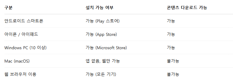 스마트폰, 태블릿(Android/iOS), Windows 10 이상의 PC에서만 가능합니다. Mac과 웹 브라우저에서는 다운로드 기능을 지원하지 않습니다.