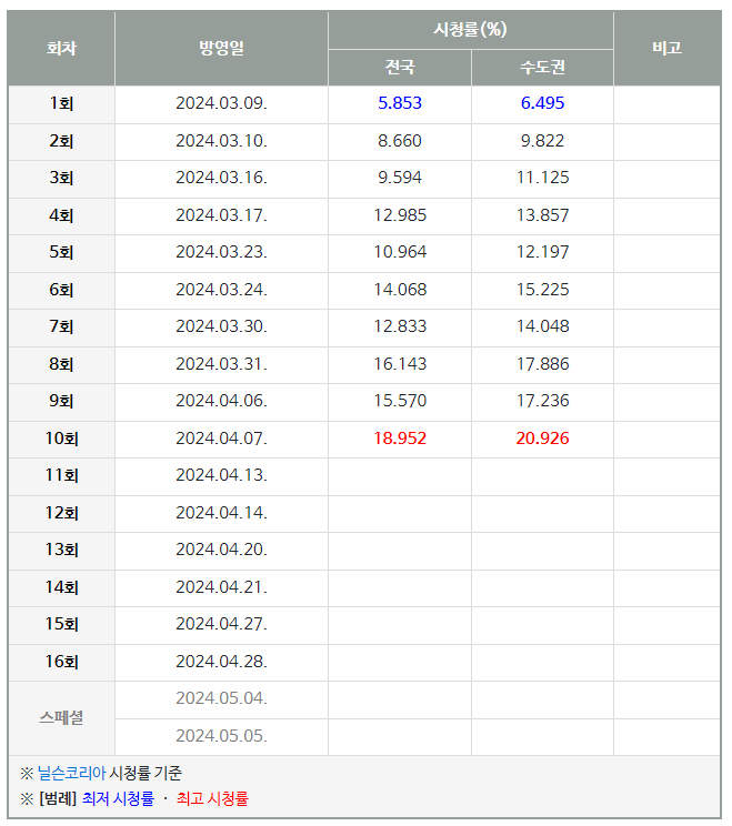 눈물의 여왕은 3월 9일 첫 회 전국 5.9%, 수도권 6.5%의 시청률을 기록했던 것에 매회 빠르게 상승하고 있는 추세입니다. 지난 10회 4.7일 방송후 전국 시청율은 18.9%, 수도권 20.9%로 5주 연속 자체 최고시청률을 갱신하고 있습니다.