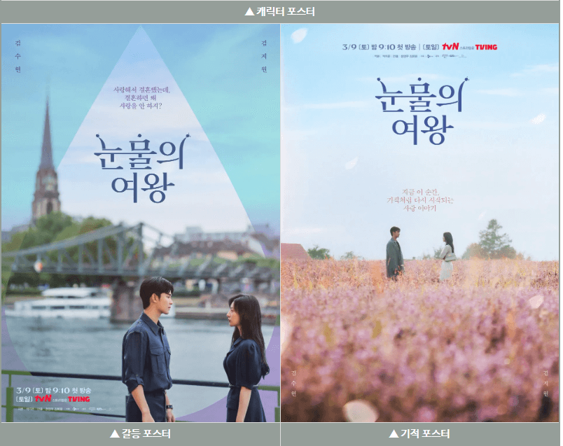 눈물의 여왕은 시골출신 슈퍼마켓 출신 청년이 하루 아침에 재벌 3세 백화점의 여왕 홍해인과 결혼하면서 벌어지는 스토리입니다. 흔한 K드라마의 소재같지만 눈물의 여왕은 사랑의 시작이 아니라 권태기가 시작되는 싯점에서 드라마는 시작합니다.