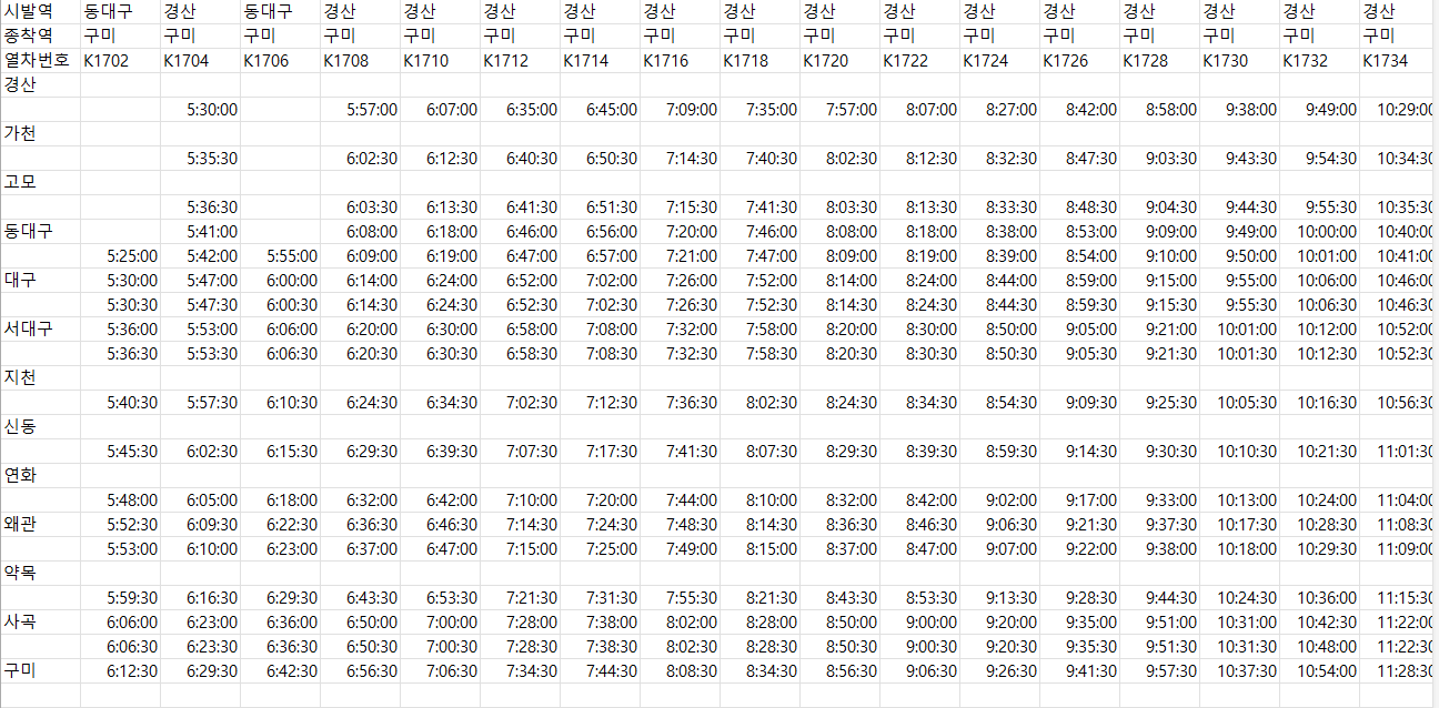 노선 전체의 첫차와 막차 시간은 오전 5시 30분 첫차, 익일 0시 30분 막차 기준이지만, 정차역별 실제 첫차·막차 시간은 다를 수 있습니다. 예를 들어, 구미에서 출발하는 첫차와 동대구에서 출발하는 첫차는 시간차가 있습니다. 따라서 반드시 코레일톡 앱이나 역별 시간표를 확인하는 것이 좋습니다.