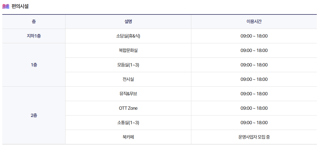 | 2층 | 청소년자료실, 청소년창작실, 뮤직&무브, OTT Zone, 소통실 |