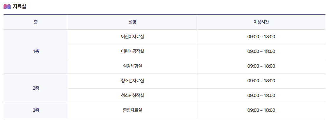 | 1층 | 어린이자료실, 어린이공작실, 실감체험실, 복합문화실, 모듬실, 전시실 |