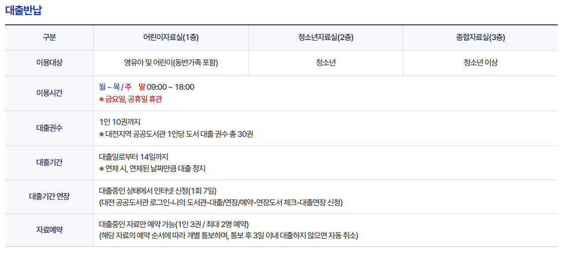 동대전도서관은 매일 오전 9시부터 오후 6시까지 운영됩니다. 매주 금요일은 정기 휴관일이며, 법정 공휴일에도 휴관합니다. 도서관 사정에 따른 임시 휴관일은 홈페이지를 통해 별도 공지됩니다. 방문 전 운영일정을 꼭 확인하세요.