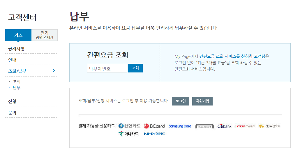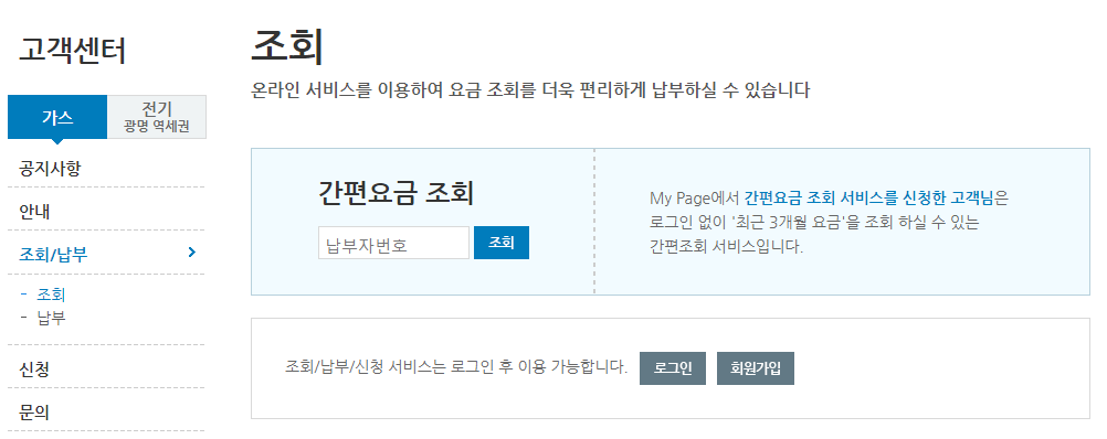 아래 예시로 서울가스와 삼천리가스회사의 가스요금 간편 조회 방법입니다. 고객센터> 조회 또는 납부를 선택할 수 있습니다.