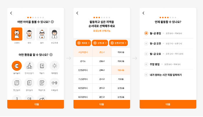 내가 돌볼 수 있는 아이의 유형을 선택할 수 있습니다. 신생아, 영아, 유아, 초등학생이 있습니다. 지역은 최대 3개까지 설정가능합니다. 또한 언제 활동할 수 있는지 시간을 입력할 수 있습니다.
