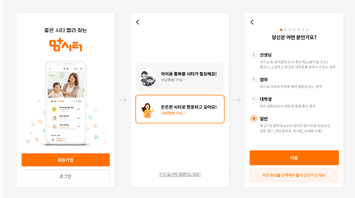 1. 맘시터 어플접속 후 시터회원 선택 가입합니다.