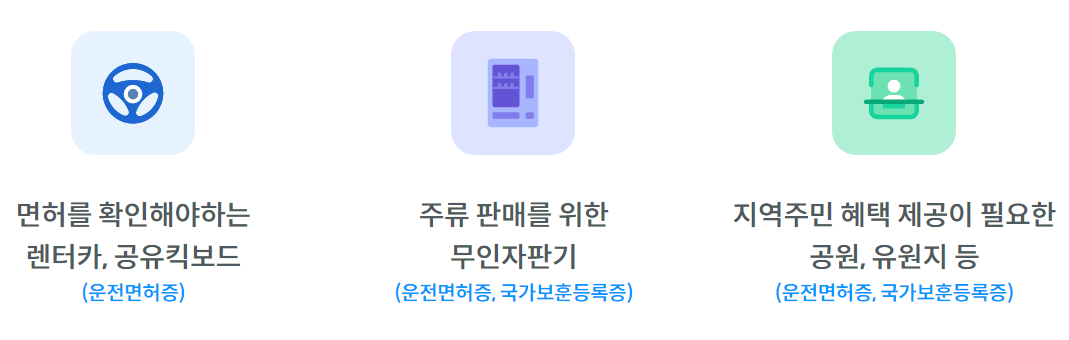5. 이 밖에도 신원확인을 요구하는 모든 공공장소에서 활용이 됩니다. 면허를 확인해야 하는 렌터카, 공유 킥보드, 주류 판매를 위한 무인자판기, 지역주민 혜택 제공이 필요한 공원 또는 유원지에서 사용이 가능합니다.