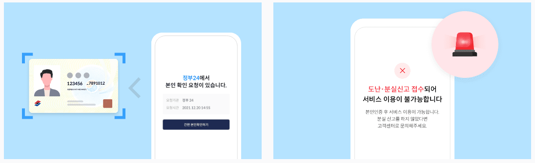 💖 온라인에서 신분증 인증 시 매번 스캔하는 번거로움 없이 모바일 신분증으로 간편하게 사용할 수 있습니다. 스마트 폰 도난이나 분실 시 홈페이지의 분실 신고를 통해 바로 잠금 할 수 있습니다.