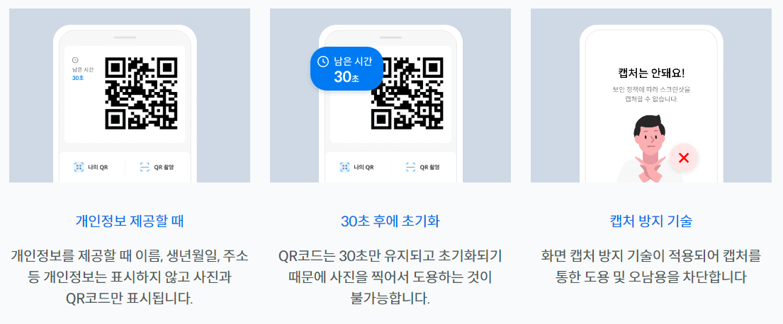 💖 모바일 신분증 사용할 때는 안전장치가 있습니다. 개인정보를 제공할 때 이름, 생년월일 등 개인정보는 표시하지 않으며 사진과 QR코드만으로 표시됩니다. 따라서 개인정보보호에 확실합니다. 불편하게 민증을 제시할 때 보여줬던 정보를 가릴 수 있습니다.