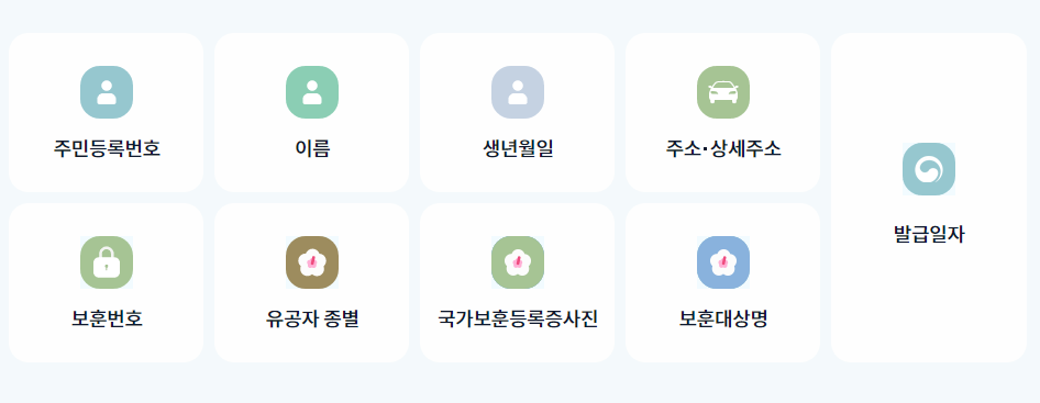 주민등록번호, 이름, 생년월일, 주소, 보훈번호, 유공자 종별, 국가보훈등록증 사진, 보훈대상명, 발급일자