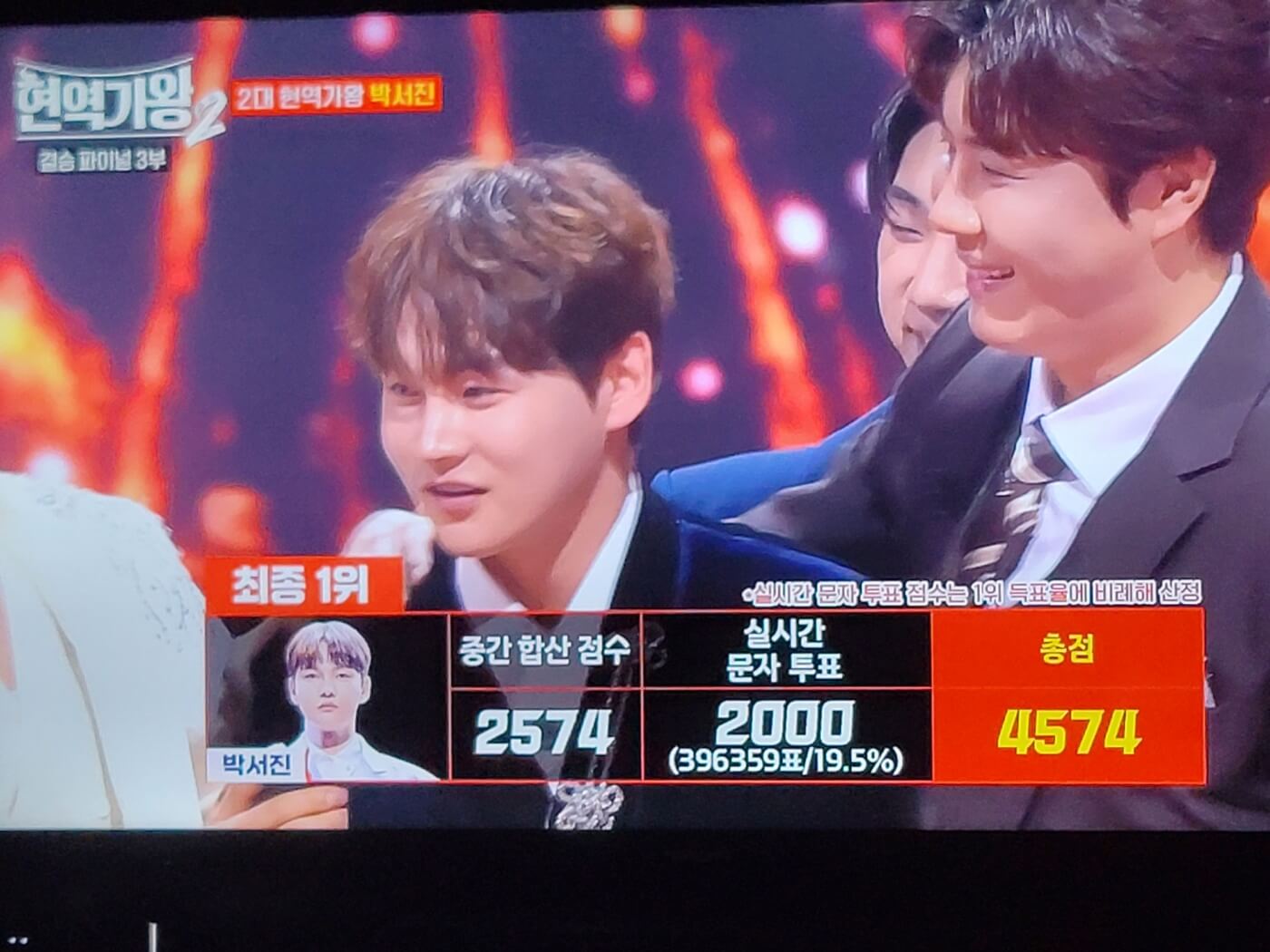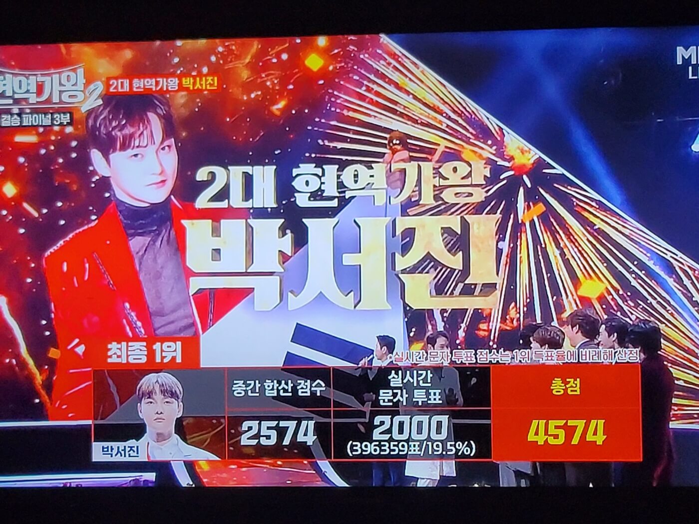‘현역가왕’ 박서진, 총점 4574점으로 우승 최종 우승자는 박서진이 차지했습니다. 그는 5000점 만점 중 4574점을 기록하며 압도적인 점수 차이로 가왕 타이틀을 거머쥐었습니다.