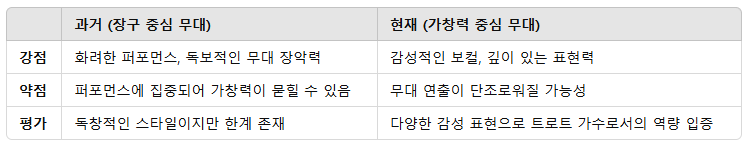 과거에는 장구와 함께하는 퍼포먼스로 강한 인상을 남겼지만, 그는 이제 순수 가창력만으로도 대중을 사로잡을 수 있다는 것을 입증하고 있습니다.