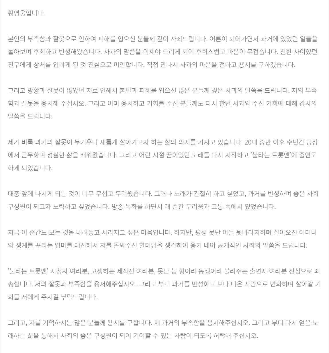 "불타" 황영웅 과거논란, 공식 사과문... 진정성 있나?