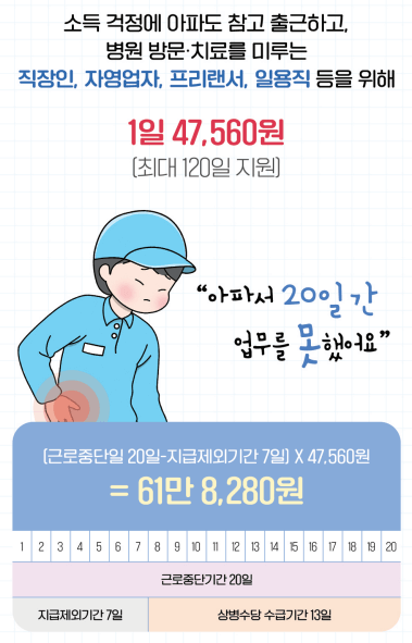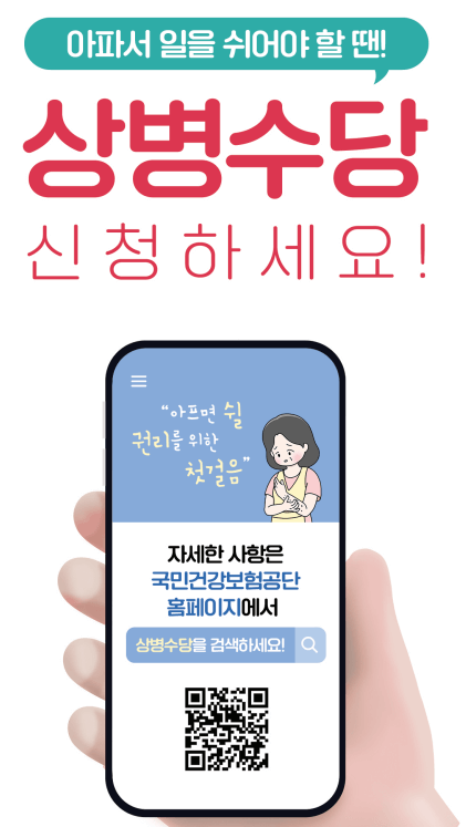 한 마디로 아파서 쉬어야 할 때 받을 수 있는 수당입니다. 이 수당은 신청하지 않으면 받을 수 없으므로 직접 신청하셔야 합니다.