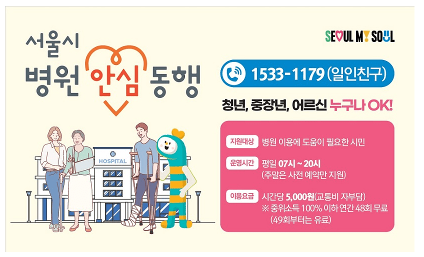 서울 병원동행서비스 예약방법, 이용요금이나 사전예약에 대해 알아보겠습니다. 우리나라 인구 절반이 살고 있는 서울특별시에서 병원동행서비스를 쉽게 예약하는 방법과 대상자를 정리하겠습니다.