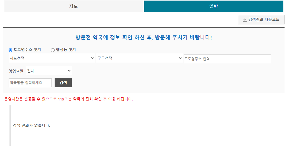 일반으로 검색하고 싶다면 일반을 선택 후 주소를 검색하면 됩니다. 일반 검색은 원하는 병원이 문을 여는지 확인할 수 있습니다.