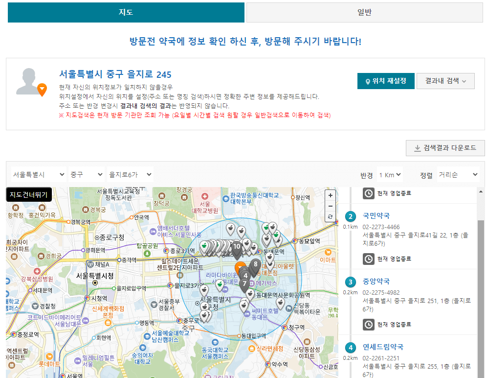 약국 찾는 방법은 두 가지입니다. 지도와 일반 검색을 선택할 수 있습니다. 지도로 원한다면 위치 본인의 위치에 재설정하면 됩니다.