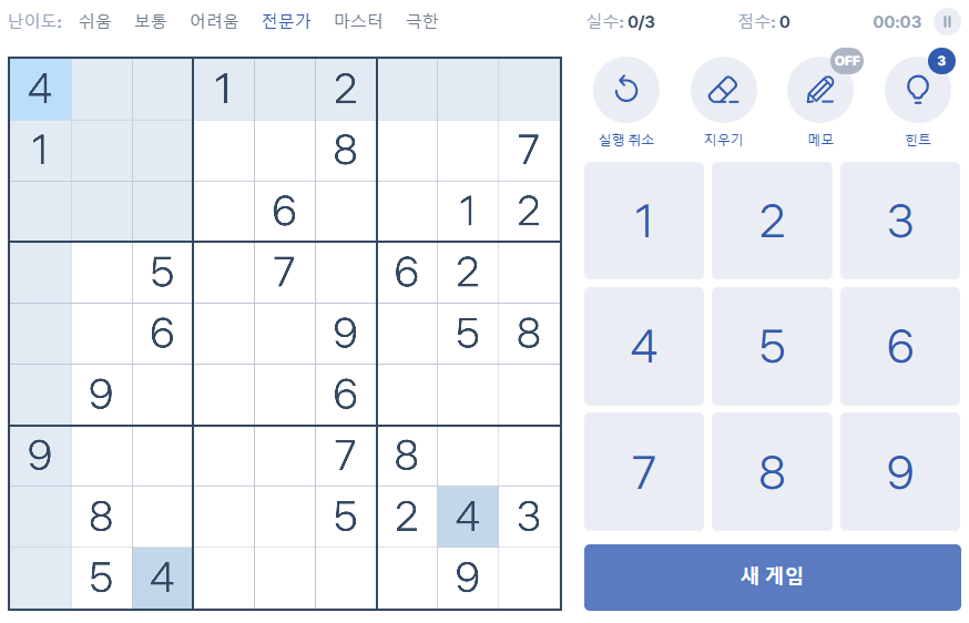 | 필요한 풀이 기술 | 쉬운 난이도는 기본으로 풀수있음 어려운 레벨은 고급 스도쿠의 기술을 요구 |