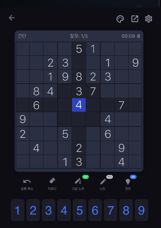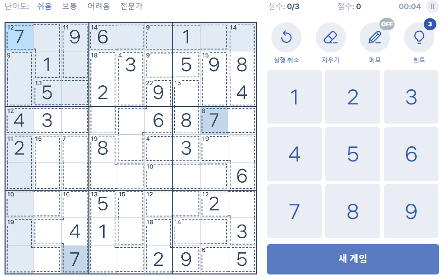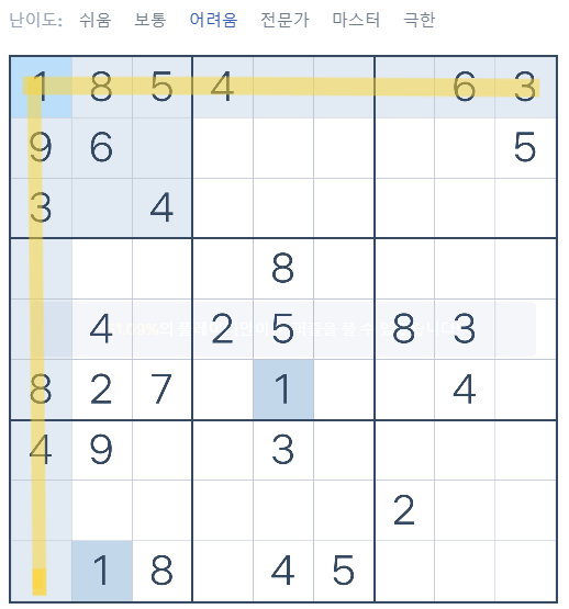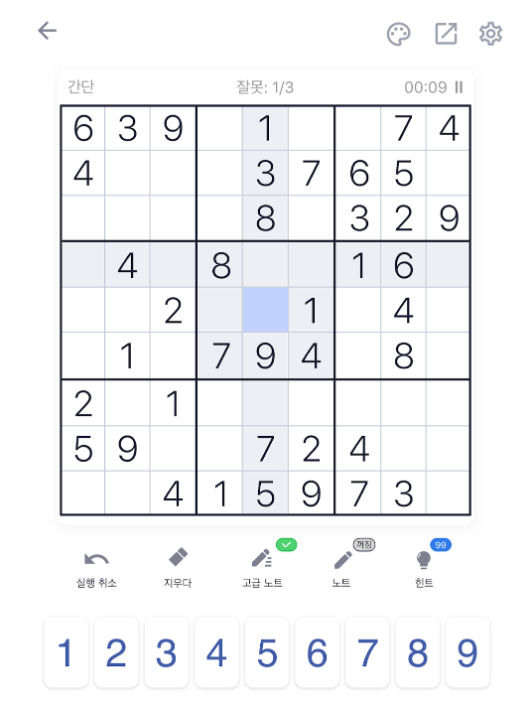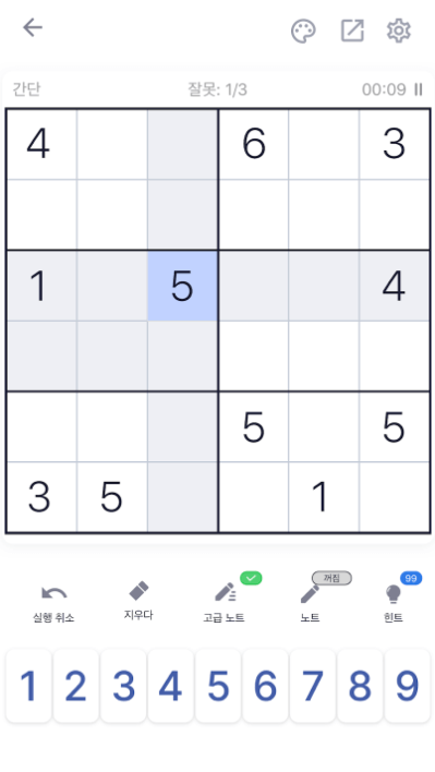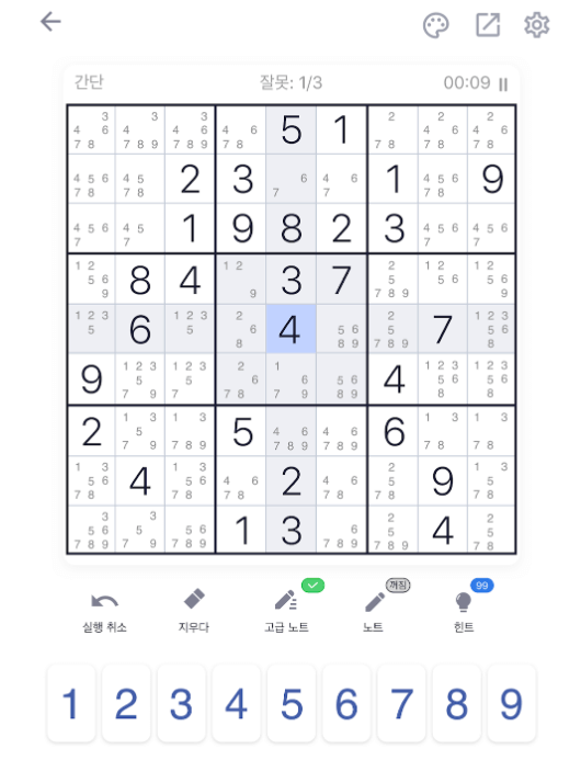 처음에는 숫자를 바로 채우지 말고, 가능한 숫자를 메모하는 방식으로 접근하세요.