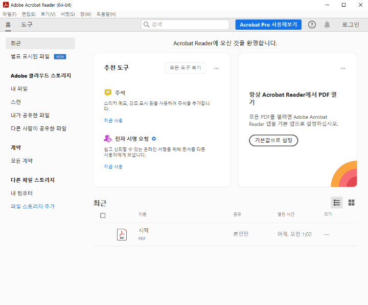 설치가 완료되었다면 아래와 같은 화면을 확인할 수 있습니다. 지금부터 어도비 pdf 애크로벳 사용이 가능합니다.