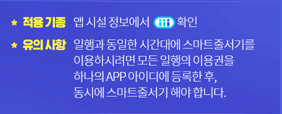 - 스마트 줄서기 시설 그룹별 동시에 각 1회 예약 가능합니다.