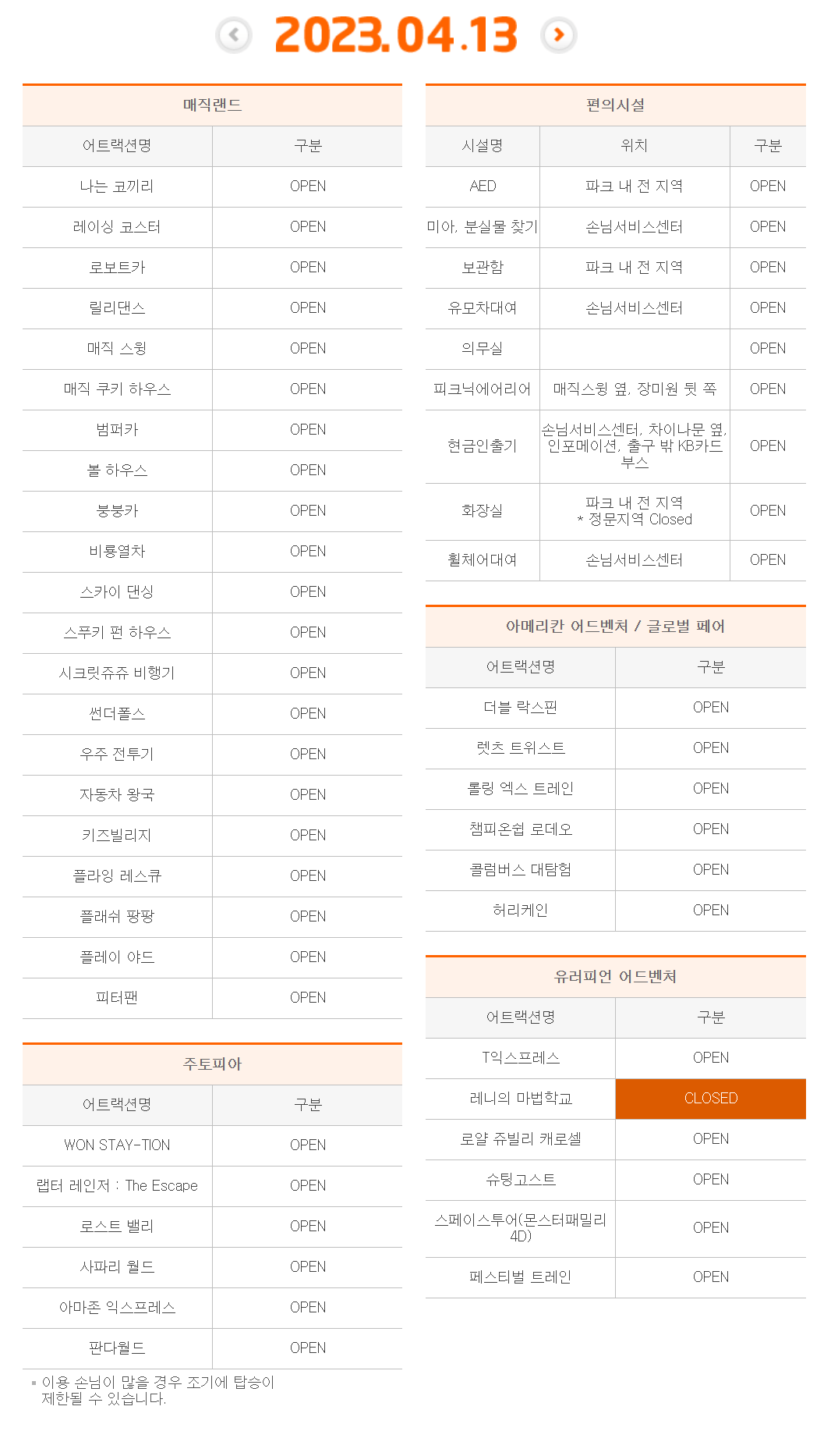 폭우, 강풍, 기온 저하 등 기상 악화 시 어트랙션 운행이 중단될 수 있으니 양해해 주시기 바랍니다. 운휴계획은 주간단위로 업데이트되므로 방문예정일의 운휴계획이 확정 전이라면 방문일 전에 운휴계획을 재확인하시기 바랍니다. 운휴계획은 현장상황에 따라 예고 없이 변경될 수 있습니다.