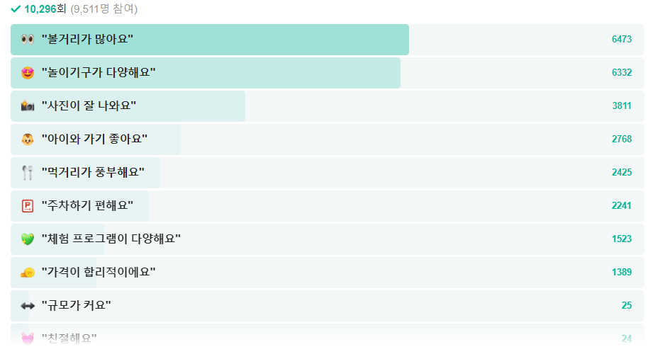 볼거리가 다양하고, 놀이기구가 다양하다는 표가 압도적입니다. 사진이 잘 나온다는 투표도 많았고요. 그럼 볼거리가 풍부한 어트랙션을 빼놓을 수가 없지요.