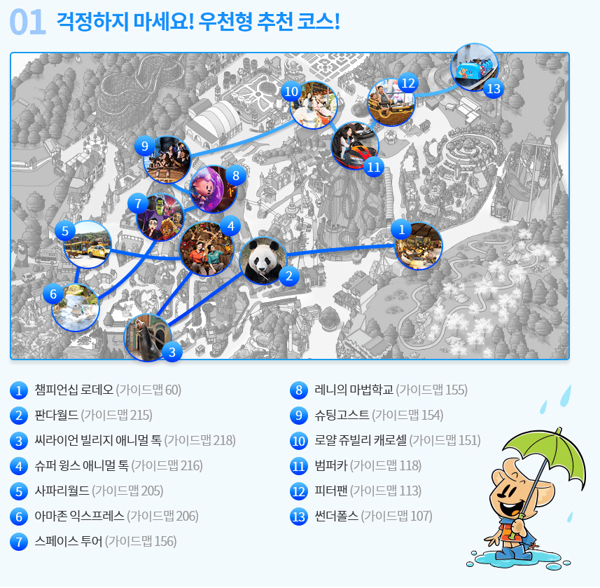 비가 올 때 에버랜드에 가면 퍼레이드가 없어서 볼거리가 없다고요~ 천만에요. 아래 코스로 가시길 바랍니다.