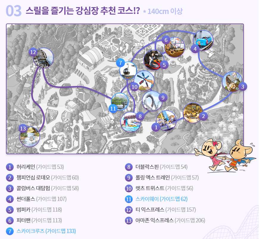 안전한 어트랙션 이용을 위해서는 탑승 중 신체적 이상이 발생되지 않는 건강상태이어야 합니다. 또한 탑승자 스스로가 좌석에 똑바로 앉아 있을 수 있어야 하며, 이용 중에는 머리와 목, 허리, 하체를 충분히 지지할 수 있어야 합니다. 각 어트랙션에 게시된 탑승자 안전수칙 준수 및 근무자의 안내에 따라 주시기 바랍니다.