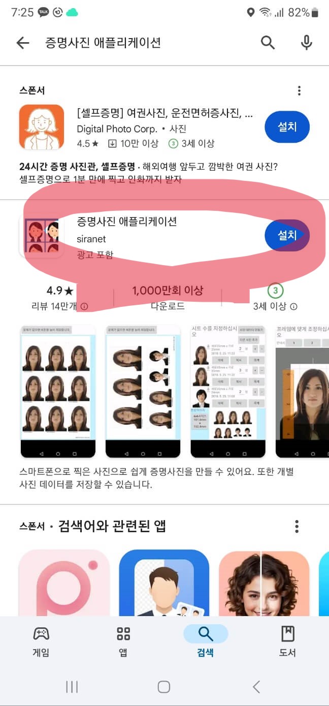이 방법은 단지 사진관에 갈 시간적 여유가 없거나, '여권 사진 신경 쓰지 않아' 하시는 분은 따라하시길 바랍니다. 다음에서 증명사진 애플리케이션 앱을 다운로드하시길 바랍니다.