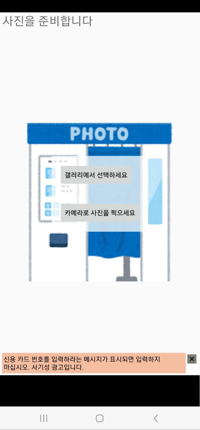 증명사진 애플리케이션을 다운받습니다. 사진을 미리 찍어놓거나 직접 찍으면서 진행할 수 있습니다. 갤러리에서 선택은 미리 찍은 사진을 가지고 오시면 됩니다.