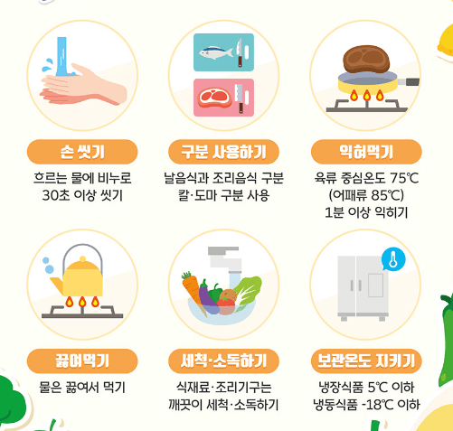 식중독 기본철칙은 손 씻기, 익혀먹기, 긇여먹기, 구분사용하기, 세척 및 소독하기, 보관온도 지키기입니다.