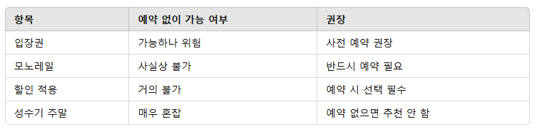 | 모노레일 2,3구간 | 일부 잔여석 현장 구매 가능 | 성수기엔 불가 |