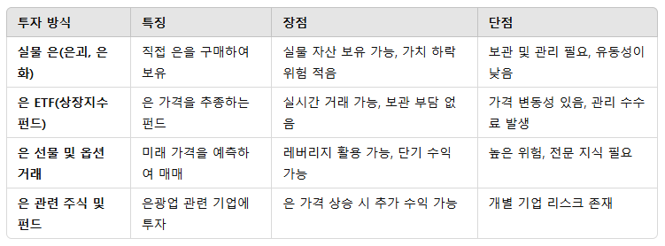 은 투자는 실물 은과 금융 상품을 활용하는 방법으로 나뉩니다. 투자 방식에 따라 수익성과 리스크가 다르며, 투자자의 목적과 투자 기간에 따라 적합한 선택이 필요합니다.