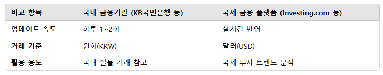 📌 추천: 실시간 차트와 함께 확인하려면 Investing.com, 국내 실물 거래를 기준으로 보려면 KB국민은행