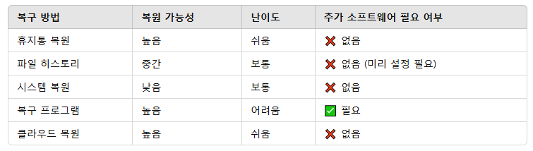 중요한 파일을 안전하게 보관하려면 다음 방법을 추천합니다. 파일 히스토리(Windows 백업) 활성화 클라우드 서비스(구글 드라이브, 원드라이브) 자동 동기화 설정 중요 파일을 다른 드라이브나 외장 하드에 주기적으로 백업 파일 삭제 시 Shift + Delete 사용 자제 (실수 방지)