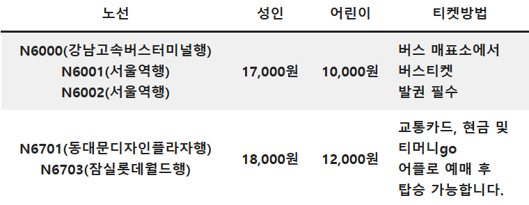 | 서울 노선 요금 | 성인 17,000원 ~ 18,000원/ 어린이 10,000원 ~ 12,000원 |