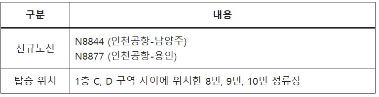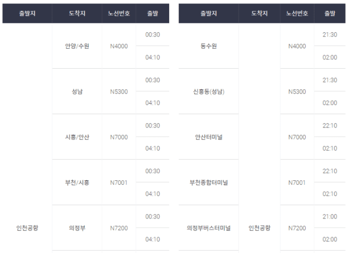 인천공항 1터미널 경기 심야버스 노선 시간표(신규)