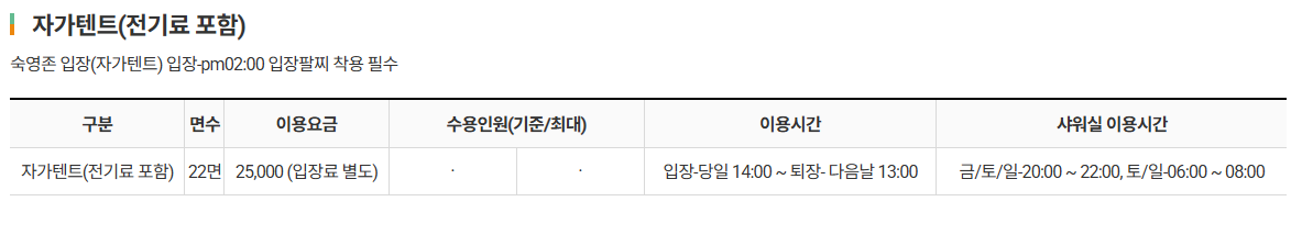 자가텐트 구역은 전기 사용이 포함된 1박 기준 25,000원입니다.