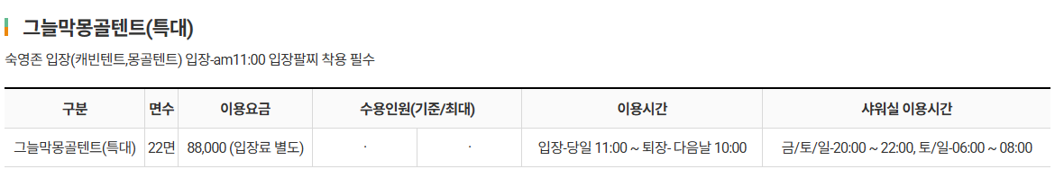 ※ 가격인상으로 자세한 가격은 예매에서 확인할 수 있습니다. 또한 가격에 따라 냉난방이 추가된 텐트가 있어 직접 확인이 필요합니다.