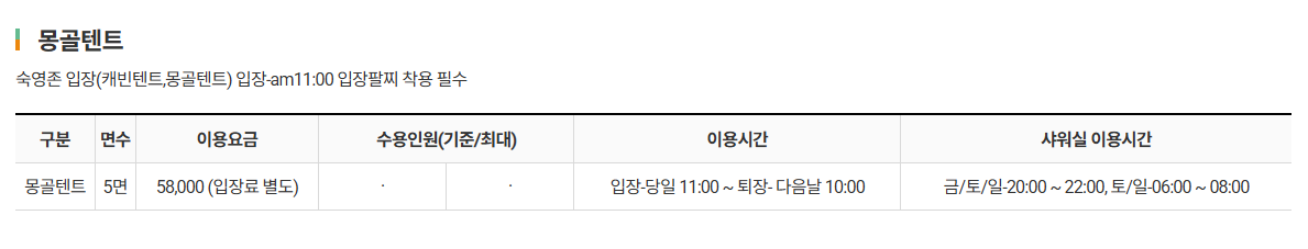 | 몽골텐트(대) | 58,000원 | 입장료 별도 |