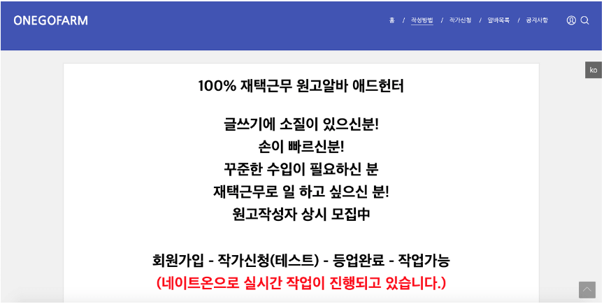 중요한 것은 글을 어느 정도 쓰는지 확인하는 원고 테스트가 있습니다. 제시된 양식에 맞게 작성하면 됩니다. 한두 번의 수정은 각오하시고요. 일반 블로그 운영자라면 이런 테스트 손쉽게 통과가능합니다. 어딜가나 쉬운 것은 없습니다. 투잡이든 아르바이트든 본인 노력여하에 달려 있습니다.