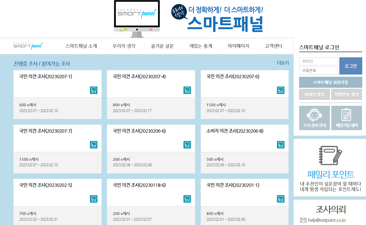 스마트패널 역시 여론조사 컴퓨터 재택 알바입니다. 간단하면서 편리하게 집에서 시간 날 때 1~2시간 참여하시면 됩니다. 하다 보면 시간이 금방 가버린답니다. 그만큼 내 통장에는 포인트가 쌓이고요.